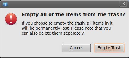 Algo que me tenía muy inquieto y desesperado en Ubuntu, es que cada que quería vaciar todos los elementos que había eliminado de un solo golpe (Con click derecho / empty trash), el sistema, me preguntaba si estaba seguro de que quería hacerlo. Lógicamente lo estaba, si no, ¿Para qué haber presionado justo en esa opción? Era un mensaje como este: